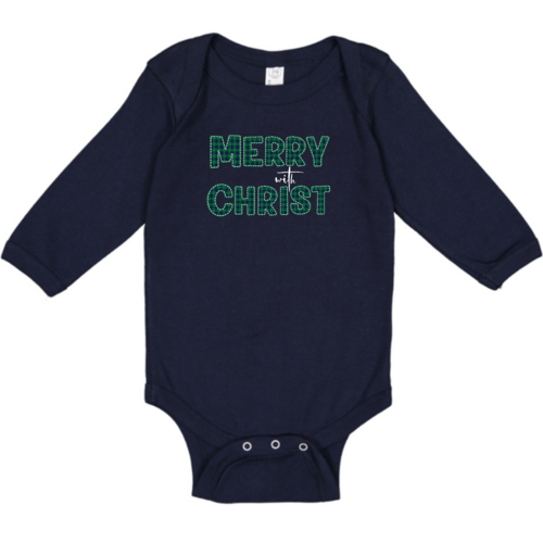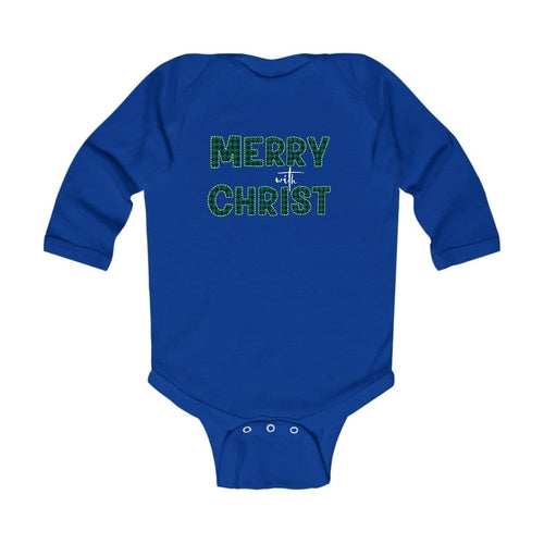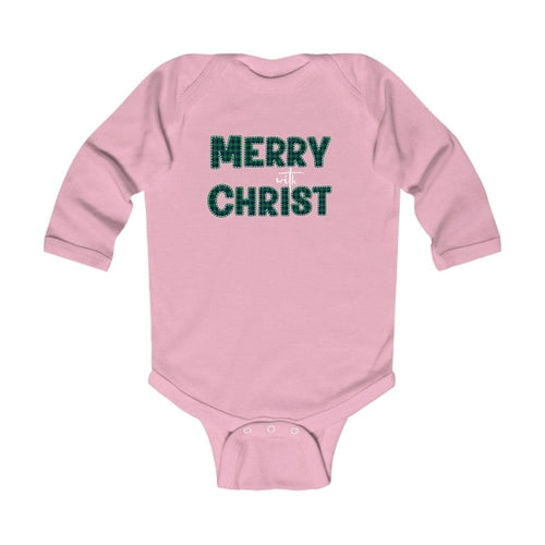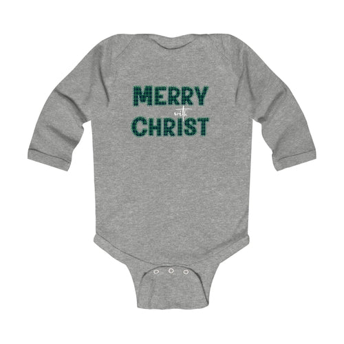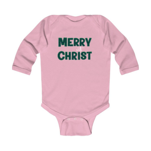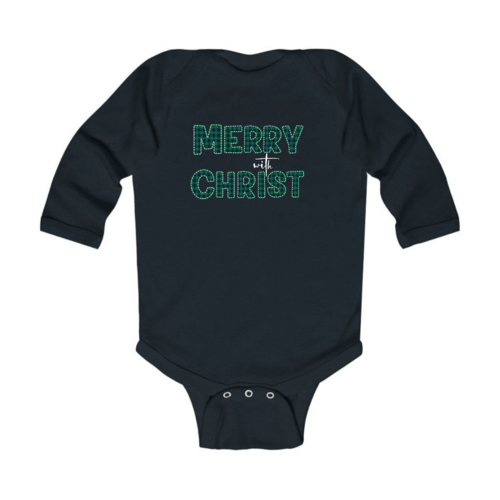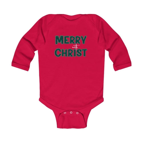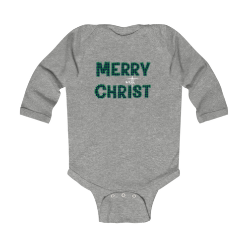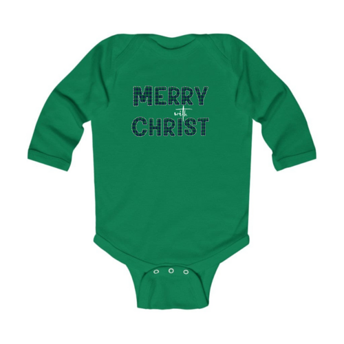 Infant Long Sleeve Graphic T-Shirt, Merry With Christ, Green Plaid Christmas Holiday Pattern Print. Classic comfort meets color with these soft lap shoulder bodysuits for babies. Whether layered or alone, this bodysuit is soft yet durable enough to stand up to your infant's playtime demands. This one-piece bodysuit features lap shoulders to make it easier for the many times a day that parents have to change baby's outfit.